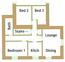 Tarmachan is a flat on the first floor of Auchmore, accessed by stairs -- not steep, but unfortunately not wheelchair friendly. The plan below shows the layout of the rooms.